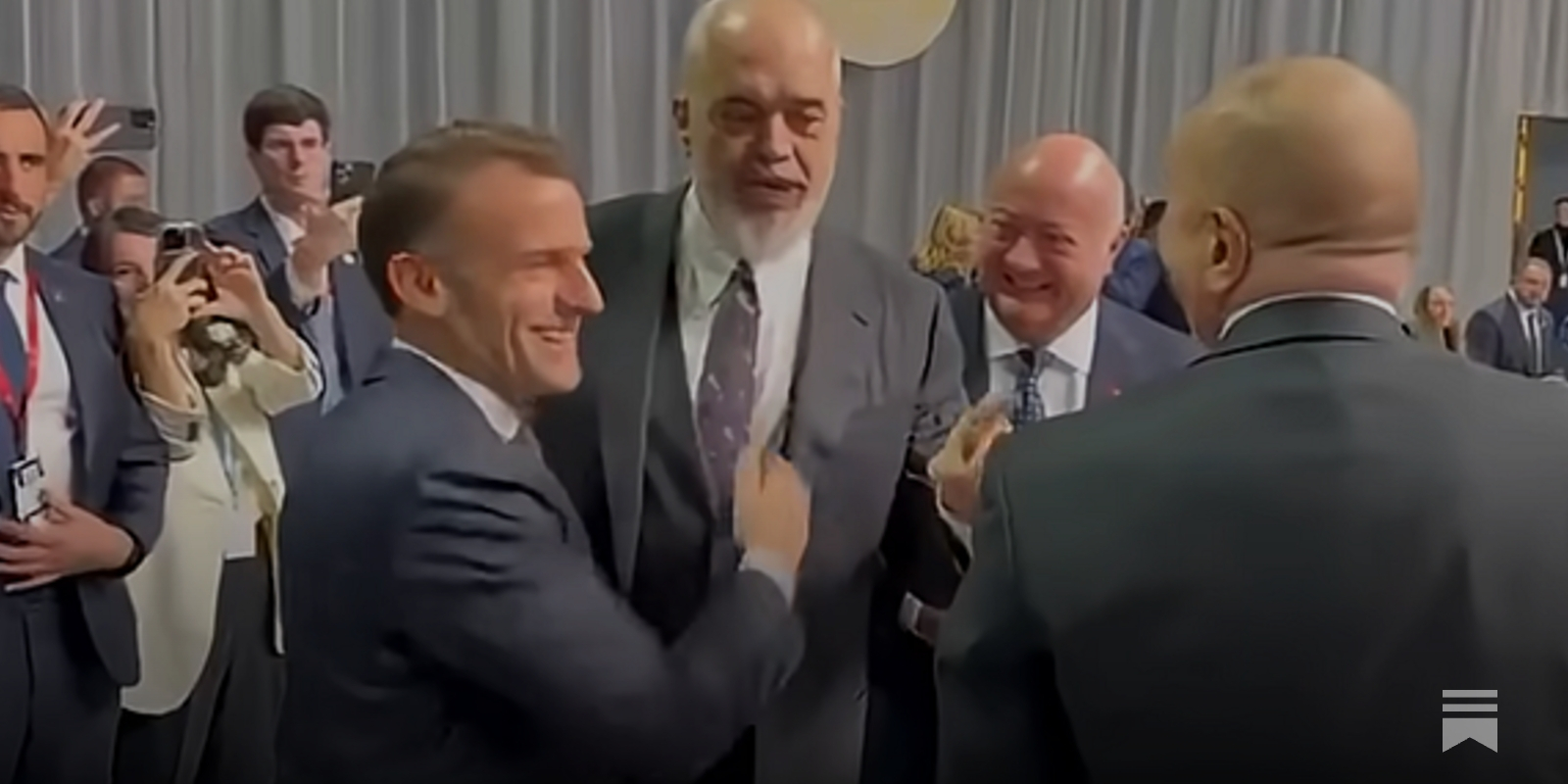 Which brings us to today’s hi-larious moment at a meeting of the European Political Community in Copenhagen, featuring Edi Rama, the prime minister of Albania, Ilham Aliyev, the president of A-BURRR-BI-JOHN, and French President Emmanuel Macron, who always seems to be around when people are punching Trump in the dick and laughing about it.